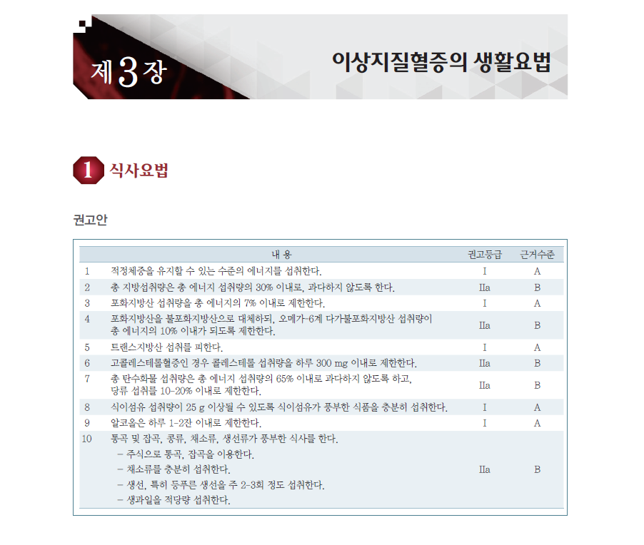 이러한 내용들을 근거로 2013 AHA/ACC 가이드라인에서는 LDL 콜레스테롤과 혈압 강하를 위해 채소, 과일, 통곡, 저지방 유제품, 기름류, 생선, 콩류, 견과류가 풍부한 식사패턴을 개인의 적절한 열량과 기호에 맞추어 구성할 것을 식사지침으로 제시하고 있으며, 2016 ESC/EAS 가이드라인도 전체적인 혈청 지질 수준을 개선하기 위해 주요 식품군(곡류, 채소, 콩류, 과일, 육류 및 생선, 유제품, 식용유 등)의 권장 식품과 주의 식품들을 제시하며, 각 개인이 본인의 기호에 맞추어 건강한 식사패턴을 만들어 가도록 하고 있다.