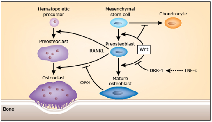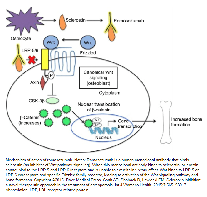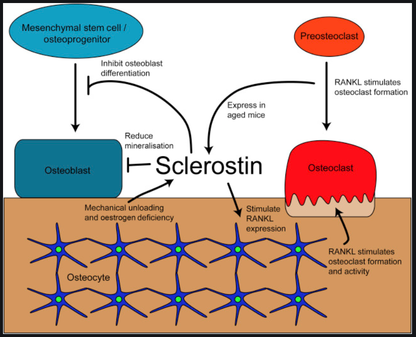 Sclerostin (스클레로스틴)은 osteocytes에서 생성되고 bone formation을 억제합니다. Romosozumab (로모소주맙)은 monoclonal anti-sclerostin antibody입니다.