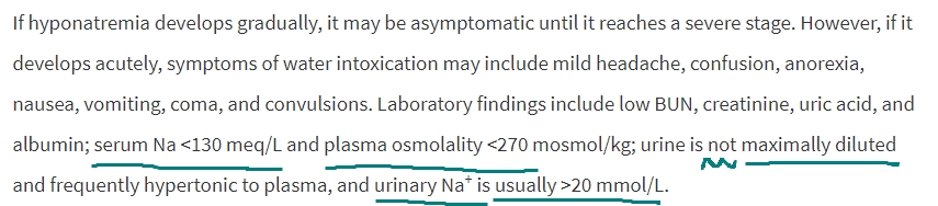 이와 관련된 내용은 세균맨 The쉬운 내과 [문제·해설]에도 언급되어 있습니다. ![]() ![]() 해리슨 20판에 언급되어 있는 SIAD에 대한 임상 특징입니다. ![]() A practical approach for determining the cause of hyponatremia ![]() IVIG: intravenous immune globulin; TURP: transurethral resection of the prostate; BP: blood pressure; ACTH: adrenocorticotropic hormone; ADH: antidiuretic hormone; TSH: thyroid-stimulating hormone; SIADH: syndrome of inappropriate antidiuretic hormone secretion. * A simple and convenient correction of the serum sodium for hyperglycemia is as follows: Add 2 mEq/L to the serum sodium for every 100 mg/dL of serum glucose above the normal value. ¶ Impaired water excretion in renal failure occurs if there is severe impairment in glomerular filtration rate. Patients with mild-to-moderate impairment in glomerular filtration rate are typically able to excrete water loads. The measured plasma osmolality may be high in patients with renal failure because of high urea concentrations. However, urea is an ineffective osmole, and such patients have hypotonic hyponatremia even if the plasma osmolality is normal. Δ Thiazide-induced hyponatremia may be protracted. An extensive evaluation for other etiologies can be delayed for several weeks in mildly hyponatremic patients. ◊ If the serum sodium is 125 mEq/L or less, we do not give isotonic saline. In such patients, the evaluation can be delayed until the sodium is slowly raised to higher levels. § Although patients with hyponatremia due to heart failure or cirrhosis will usually have edema that is clinically apparent, hypovolemia may not always be apparent by clinical exam. Thus, in a patient who appears to be euvolemic but whose urine chemistries are consistent with hypovolemia, infusion of isotonic saline (eg, 1 liter over one hour) can be helpful. REF. Williams Textbook of Endocrinology, 14th edition Harrison's Internal Medicine, 20th edition UpToDate 2020.08.05 |