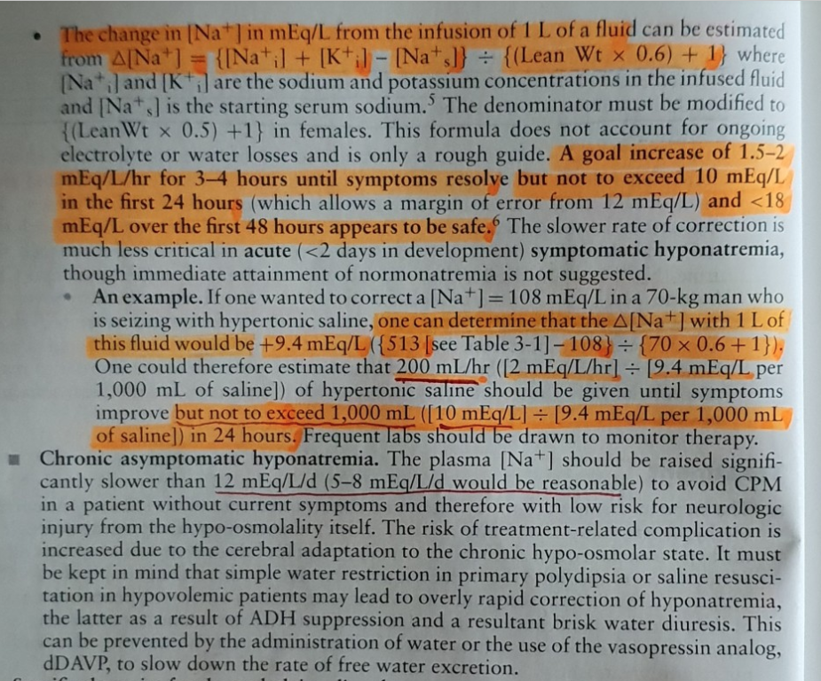 Mild-to-moderate symptoms Initial hypertonic saline therapy using either a continuous infusion or a 50 to 100 mL bolus followed by a continuous infusion to raise the serum sodium by 3 to 4 mEq/L may be justified in the first three to four hours in patients with distressing symptoms (eg, confusion and lethargy). In the calculations described above, 500 mL of hypertonic saline initially raised the serum sodium by 6.5 mEq/L in a 60 kg woman and 4.6 mEq/L in a 70 kg man. Thus, raising the serum sodium by 4 mEq/L in four hours would require approximately 300 mL of hypertonic saline in the woman and 400 mL in the man. These calculations are only estimates and the serum sodium should be measured at two to three hours. The total elevation in serum sodium in the first 24 hours should be no more than 8 mEq/L UpToDate 2020.08.05  |