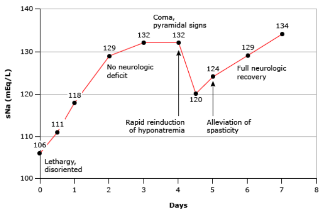 Neurologic symptoms of osmotic demyelination syndrome (ODS) typically occur 2 to 6 days after correction of the hyponatremia. In this patient, severe hyponatremia was corrected too quickly (23 mEq/L in 48 hours), and coma developed 2 days later. The serum sodium was quickly relowered and then slowly corrected. Neurologic symptoms improved, which may have been due to relowering of the serum sodium or may have represented spontaneous resolution. Reproduced with permission from: Oya S, Tsutsumi K, Ueki K, Kirino T. Reinduction of hyponatremia to treat central pontine myelinolysis. Neurology 2001; 57:1931