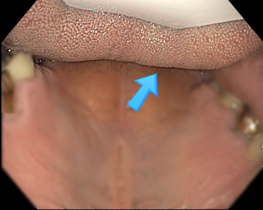 이 방법이 용이하지 않는 경우 우측 pyriform sinus로 삽입하는 것을 시도하였습니다. (파란색 화살표)