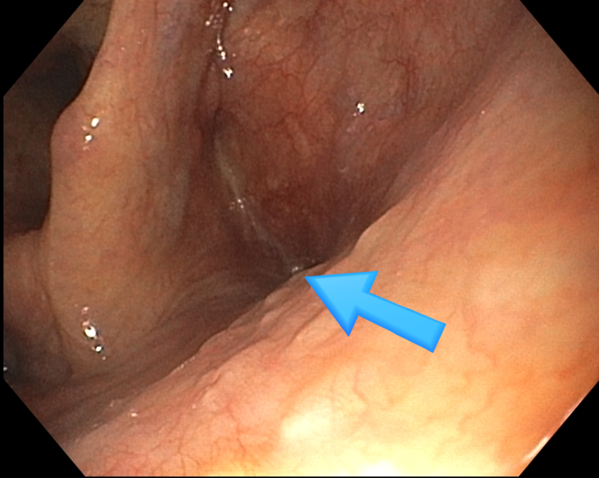 내시경 scope을 삽입할 때 절대 blind로 scope을 밀지 마십시요. 아래 사진처럼 pyriform diverticulum이 있을 수도 있고 가끔식 이 정도는 아니지만 diverticulum처럼 약간 들어간 부위도 있습니다. 대부분 큰 문제는 없지만 tear, perforation이 발생할 수도 있습니다.