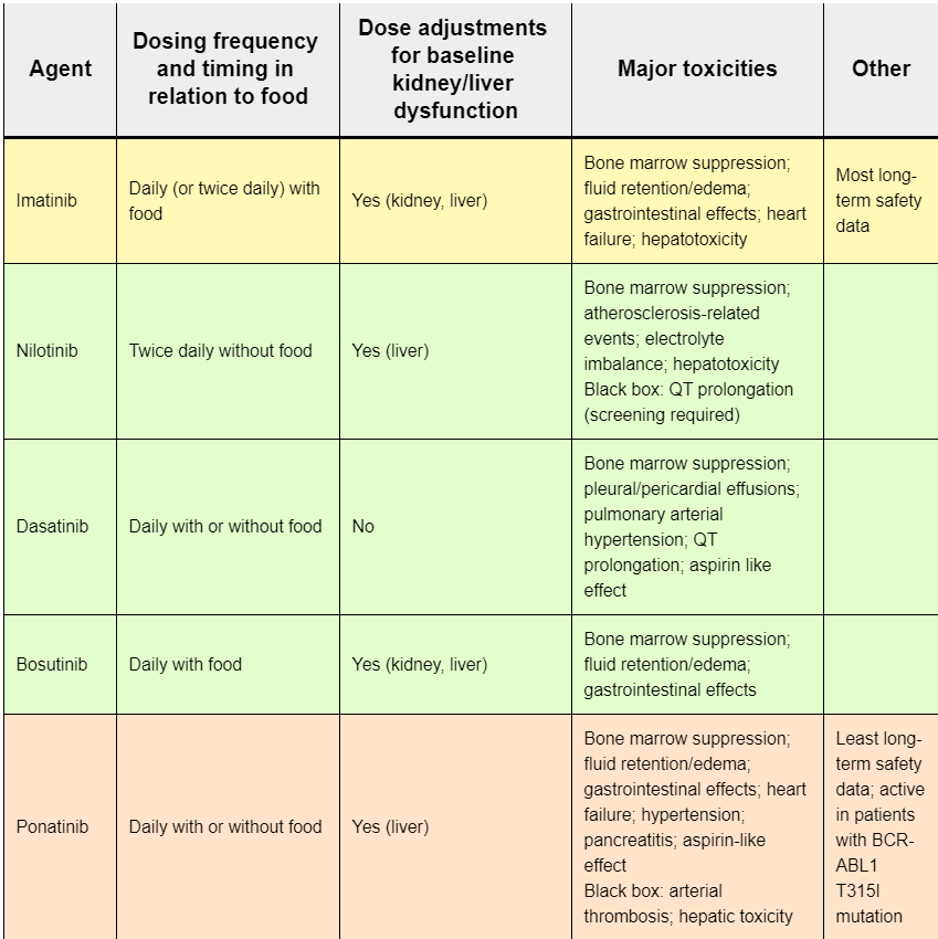 ●For patients with arrhythmias, heart disease, or hyperglycemia, we favor imatinib, bosutinib, or dasatinib ●For patients with a history of pancreatitis we try to avoid nilotinib and bosutinib ●For patients with a history of lung disease or at risk for pleural effusion, we favor imatinib, nilotinib, or bosutinib |