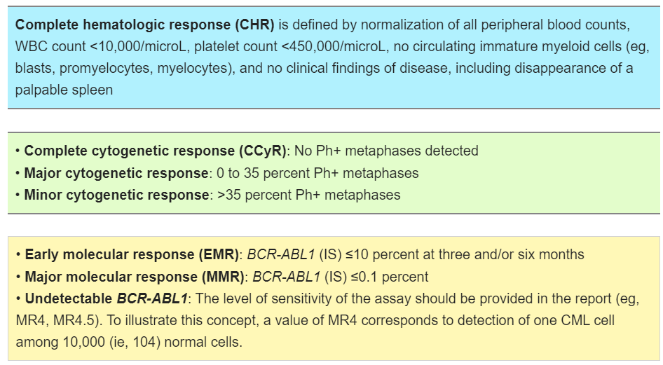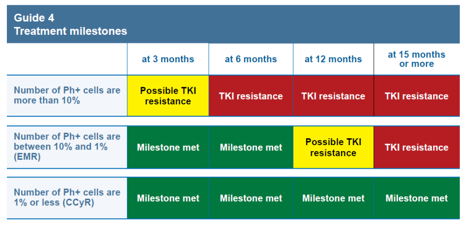 Chronic phase CML의 first-line treatment는 TKIs이고 목표는 complete molecular response (CMR)입니다.