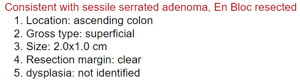 Sessile serrated polyp(s) <10 mm with no dysplasia |