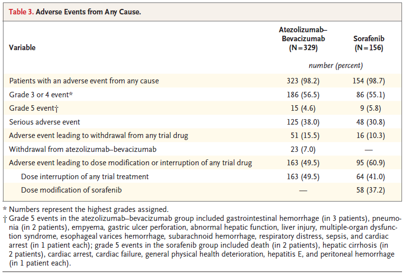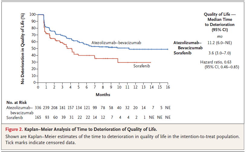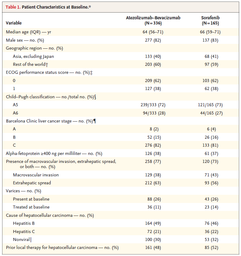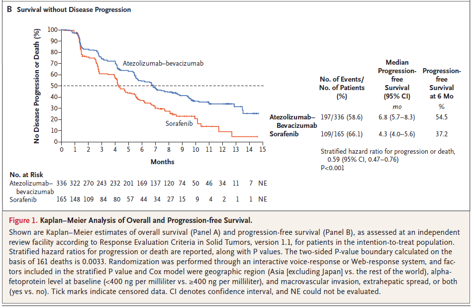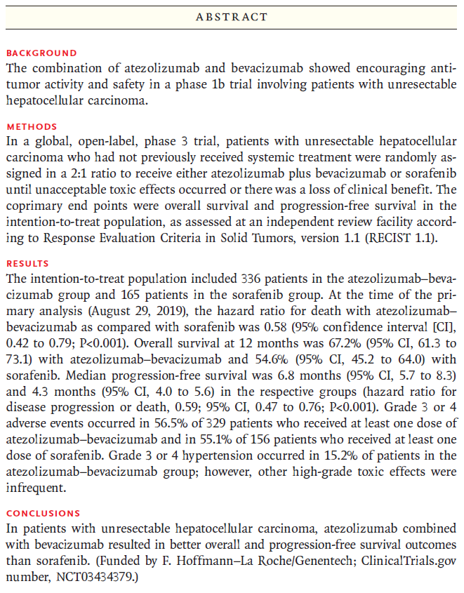 BACKGROUND The combination of atezolizumab and bevacizumab showed encouraging antitumor activity and safety in a phase 1b trial involving patients with unresectable hepatocellular carcinoma. METHODS In a global, open-label, phase 3 trial, patients with unresectable hepatocellular carcinoma who had not previously received systemic treatment were randomly assigned in a 2:1 ratio to receive either atezolizumab plus bevacizumab or sorafenib until unacceptable toxic effects occurred or there was a loss of clinical benefit. The coprimary end points were overall survival and progression-free survival in the intention-to-treat population, as assessed at an independent review facility according to Response Evaluation Criteria in Solid Tumors, version 1.1 (RECIST 1.1). RESULTS The intention-to-treat population included 336 patients in the atezolizumab–bevacizumab group and 165 patients in the sorafenib group. At the time of the primary analysis (August 29, 2019), the hazard ratio for death with atezolizumab– bevacizumab as compared with sorafenib was 0.58 (95% confidence interval [CI], 0.42 to 0.79; P<0.001). Overall survival at 12 months was 67.2% (95% CI, 61.3 to 73.1) with atezolizumab–bevacizumab and 54.6% (95% CI, 45.2 to 64.0) with sorafenib. Median progression-free survival was 6.8 months (95% CI, 5.7 to 8.3) and 4.3 months (95% CI, 4.0 to 5.6) in the respective groups (hazard ratio for disease progression or death, 0.59; 95% CI, 0.47 to 0.76; P<0.001). Grade 3 or 4 adverse events occurred in 56.5% of 329 patients who received at least one dose of atezolizumab–bevacizumab and in 55.1% of 156 patients who received at least one dose of sorafenib. Grade 3 or 4 hypertension occurred in 15.2% of patients in the atezolizumab–bevacizumab group; however, other high-grade toxic effects were infrequent. CONCLUSIONS In patients with unresectable hepatocellular carcinoma, atezolizumab combined with bevacizumab resulted in better overall and progression-free survival outcomes than sorafenib. (Funded by F. Hoffmann–La Roche/Genentech; ClinicalTrials.gov number, NCT03434379.) |