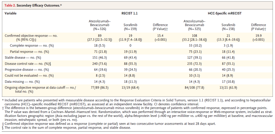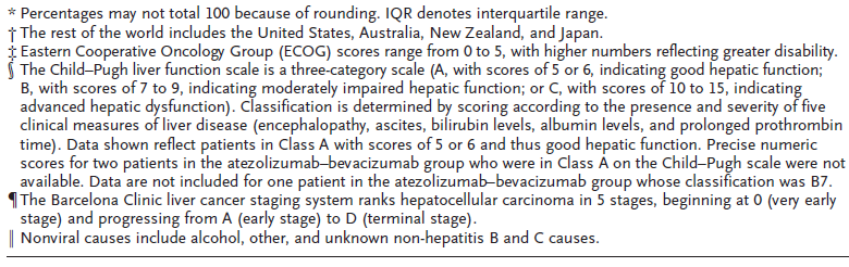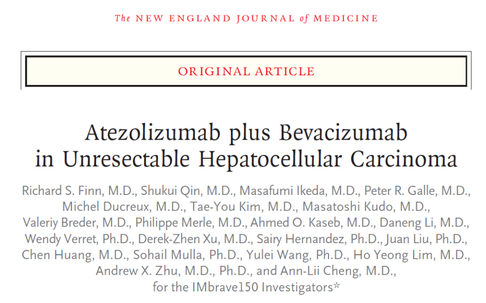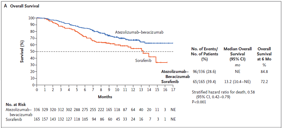 소라페닙 단독치료는 unresectable hepatocellular cancer의 표준 1차 치료제입니다. Child-Pugh A cirrhosis보다 나쁘지 않은 이전에 치료받지 않은 500명 이상의 환자를 대상으로 atezolizumab plus bevacizumab을 sorafenib과 비교한 시험에서 atezolizumab plus bevacizatezolimubaumab 그룹이 객관적 반응률이 2배였고 생존률과 PFS 모두 개선시켰습니다. 이 데이터에 근거하여 atezolizumab plus bevacizumab은 2020년 5월 29일 US FDA로부터 이전 전신 치료를 받지 않은 unresectable or metastatic HCC 환자를 위해 승인되었습니다.