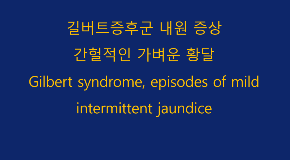 이 환자는 이전 혈액검사에서 총빌리루민 1.7 정도의 경한 빌리루빈 증가가 있었고, 복부 초음파와 복부 CT에서 작은 혈관종이 확인되었습니다. 다른 소견은 정상이었으므로 길버트 증후군으로 여겨집니다. 이렇게 길버트 증후군은 경한 간헐적 황달 증상으로 내원을 많이 합니다.