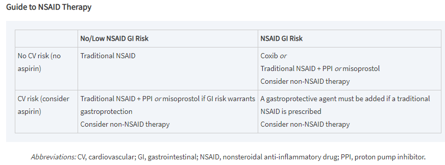 즉, 심혈관위험이 있는 환자에서 진통소염제는 안 쓰면 좋겠지만 써야 할 상황이라면 nonselective NSAIDs를 사용하고, 위장관 보호가 필요하다면 PPI를 함께 사용합니다.