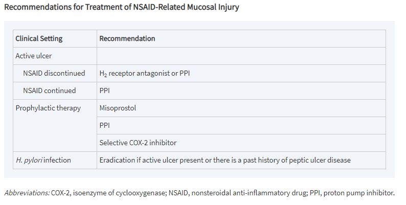Individuals who are not at risk for CV events do not use aspirin and are without risk for GI complications can receive nonselective NSAIDs without gastric protection. In those without CV risk factors but with a high potential risk (prior GI bleeding or multiple GI risk factors) for NSAID-induced GI toxicity, cautious use of a selective COX-2 inhibitor and co-therapy with misoprostol or high-dose PPI are recommended. Individuals at moderate GI risk without cardiac risk factors can be treated with a COX-2 inhibitor alone or with a nonselective NSAID with misoprostol or a PPI. Individuals with CV risk factors, who require low-dose aspirin and have low potential for NSAID-induced toxicity, should be considered for a non-NSAID agent or use of a traditional NSAID such as naproxen (lower CV side effects) in combination with gastric protection, if warranted. Finally, individuals with CV and GI risks who require aspirin must be considered for non-NSAID therapy, but if that is not an option, then gastric protection with any type of NSAID must be considered. Any patient, regardless of risk status, who is being considered for long-term traditional NSAID therapy, should also be considered for H. pylori testing and treatment if positive.  |