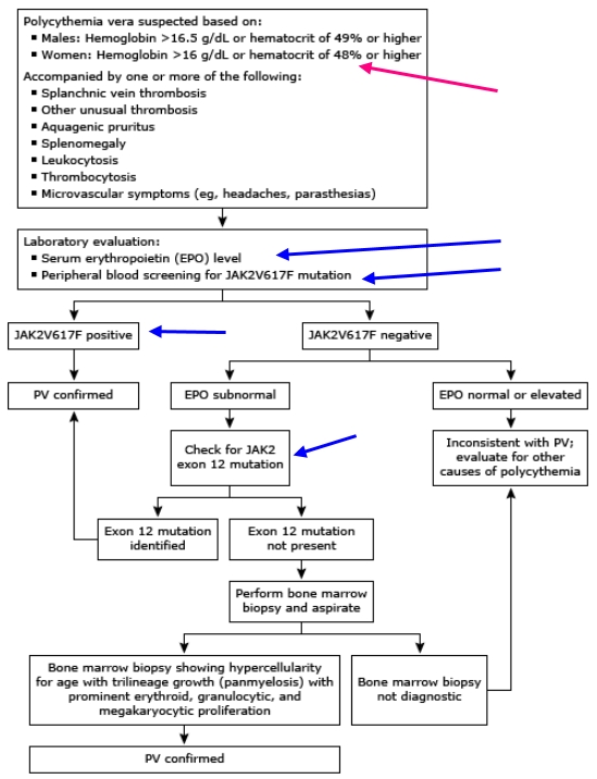 ¶ Criterion number 2 (bone marrow biopsy) may not be required in cases with sustained absolute erythrocytosis: hemoglobin levels >18.5 g/dL in men (hematocrit, 55.5%) or >16.5 g/dL in women (hematocrit, 49.5%) if major criterion 3 and the minor criterion are present. However, initial myelofibrosis (present in up to 20% of patients) can only be detected by performing a bone marrow biopsy; this finding may predict a more rapid progression to overt myelofibrosis (post-PV MF).