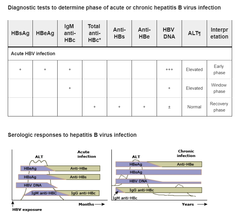 감염 초기에 HBV의 복제 표지자인 HBeAg과 HBV DNA 또한 존재합니다. HBV DNA, HBeAg가 anti-HBe로 혈청전환되고 연이어 HBsAg이 anti-HBs로 혈청전환되면서 회복됩니다.