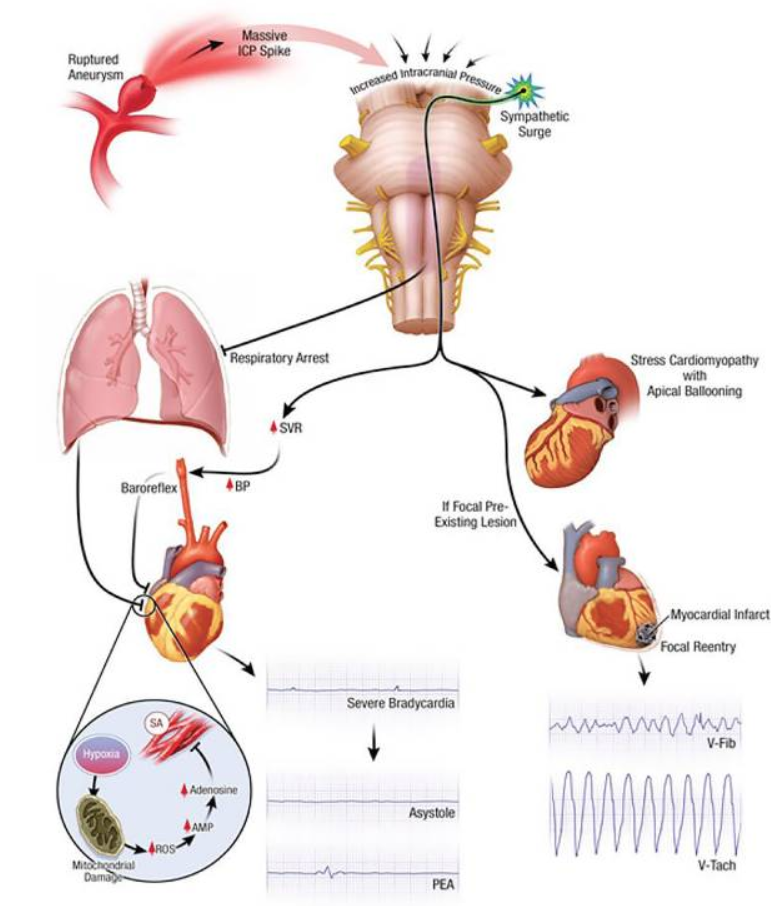 다음은 ruptured intracranial aneurysm이 cardiac arrest를 일으키는 기전에 대한 내용입니다.