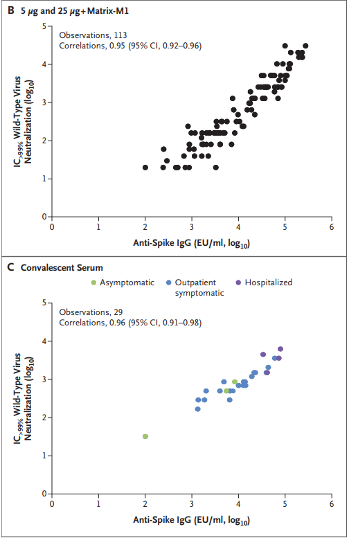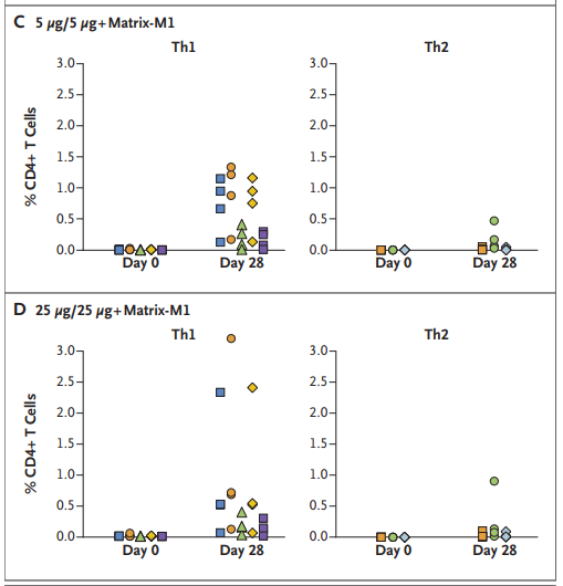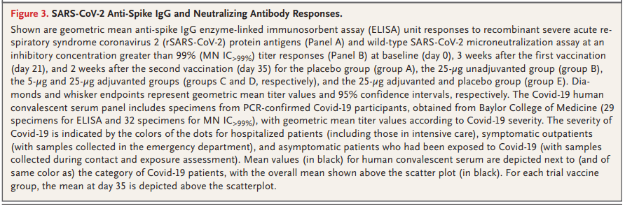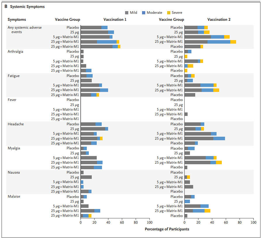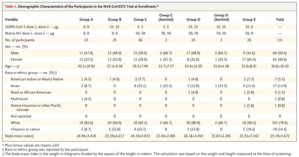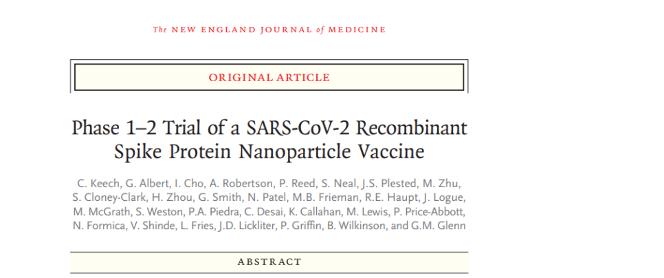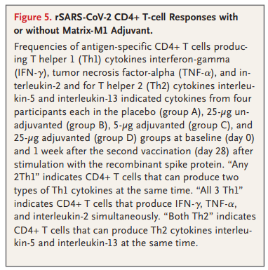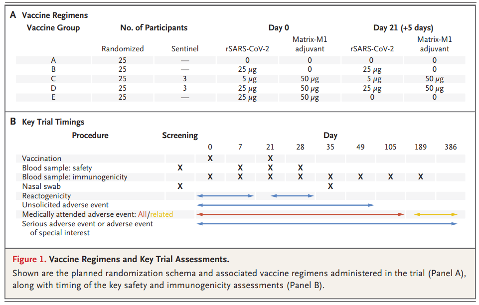 NVX-CoV2373은 trimeric spike glycoproteins과 첨가 물질인 Matrix-M1으로 이루어진 recombinant protein nanoparticle vaccine입니다. 이 백신은 근육 (IM) 주사로 21 간격을 두고 2회 맞습니다. 60세 미만, 건강한 사람을 대상으로 한 I/II 상 무작위, 위약-대조 시험에서 adjuvanted vaccine은 COVID-19로 입원한 환자의 회복기 혈장과 비견할만하게 높은 결합과 중화 반응을 유도하였습니다. CD4 cell responses with a Th1 bias 또한 확인되었습니다. 참여자의 약 6%는 2회 접종 후 중중의 전신 반응 (주로 피곤, 두통, 근육통, 권태감)을 호소하였습니다.