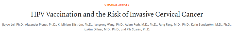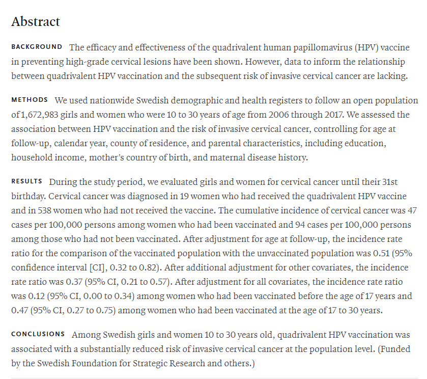 Most clinical trial data on the impact of human papillomavirus (HPV) vaccination on cervical disease demonstrate reductions in cervical intraepithelial neoplasia and adenocarcinoma in situ. In a nationwide study from Sweden that included over 1.6 million females aged 10 to 30 years, HPV vaccine receipt was associated with a reduction in the incidence of invasive cervical cancer (47 versus 94 cases per 100,000 among those who had not been vaccinated; adjusted incidence rate ratio 0.37, 95% CI 0.21-0.57) [1]. The lowest incidence was among those who were vaccinated before 17 years of age. These findings lend further support for routine HPV vaccination in individuals in the appropriate age range, ideally prior to sexual debut.