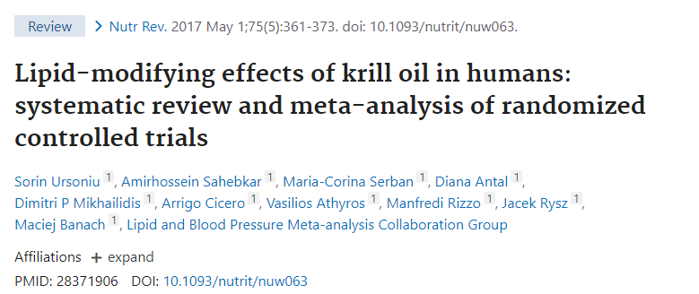 7개의 시험들과 (trials) 662명의 참가자를 포함한 메타분석에서 크릴오일 보충제 (1-4 g/하루, 24주)는 LDL콜레스테롤 (-15.5 mg/dL, 95% CI -28.4 to -2.6 mg/dL)과 중성지방 (-14.0 mg/dL, 95% CI -21.4 to -6.7 mg/dL)을 줄였습니다. 게다가 혈중 HDL 콜레스테롤은 증가하였습니다 (6.6 mg/dL, 95% CI 2.3 to 11.0 mg/dL).