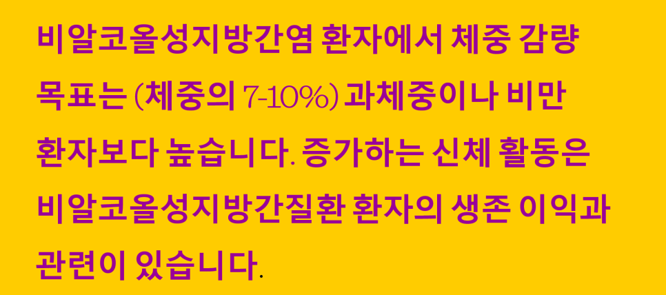 일부 환자에서 초기 목표를 넘어서는 체중 감량이 필요하기도 합니다. 혈청 ALT 수치가 정상화되지 않으면 (ALT <20 (여자), <30(남자)) 추가적인 체중 감량을 권유합니다.