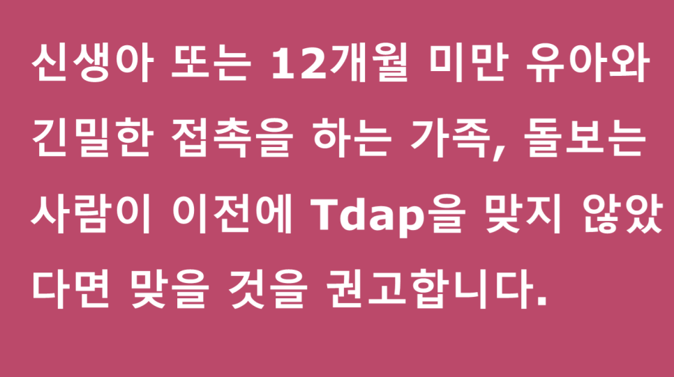 임신부는 임신할 때마다 Tdap을 맞아야 하지만, 긴밀한 접촉을 하는 가족 또는 돌보는 사람은 1회 접종으로 충분하며 임신부처럼 매번 맞을 필요는 없습니다.