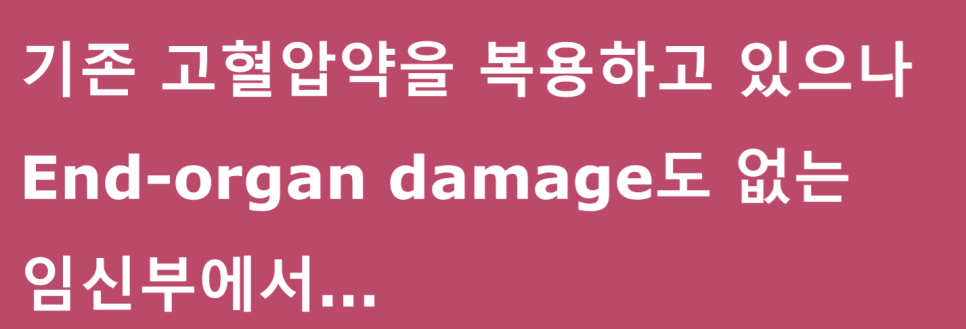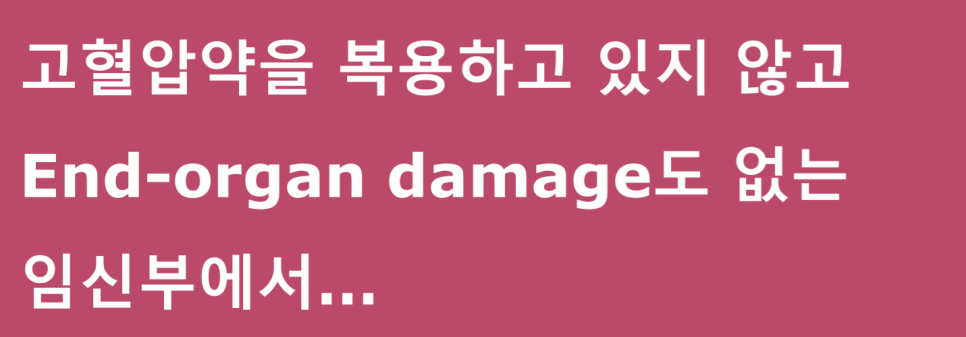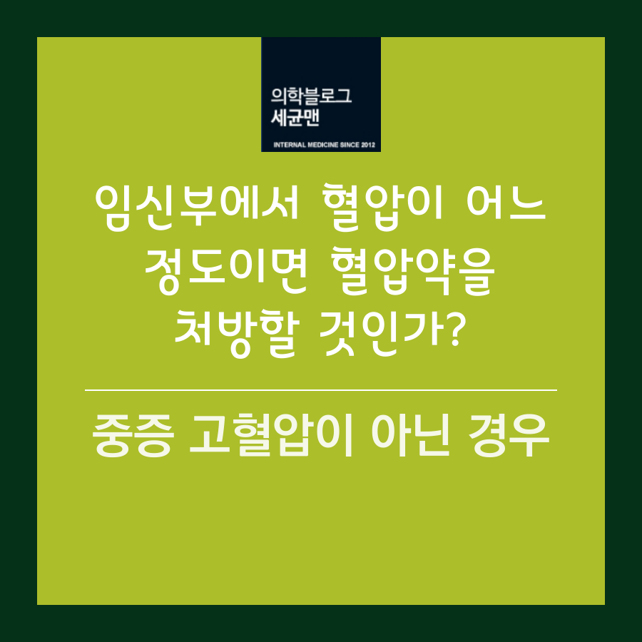 수축기 혈압이 140 이상이지만 160 미만 또는 이완기 혈압이 90 이상이지만 110 미만인, 즉 중증 고혈압이 아닌 임신부가 고혈약 약을 복용하고 있지도 않고 end-organ damage도 없는 경우 혈압약 처방은 혈압이 중증 고혈압으로 접근할 때 시작합니다. 그 이유는 중증 산모 고혈압의 발생을 막고 태아 노출을 최소화하기 위함입니다.