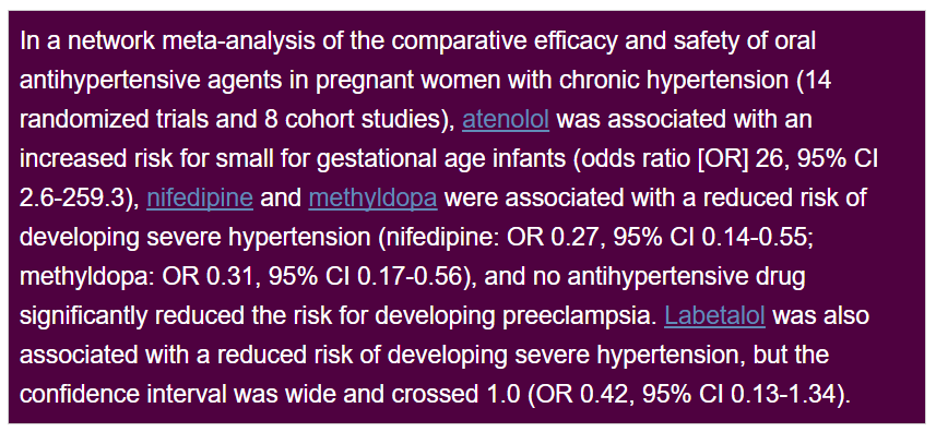중증 고혈압이 아닌 경우 약제 선택에 대한 내용은 다음과 같습니다. 보통 labetalol, long-acting CCB (예, 니페디핀 서방정), methyldopa를 시작합니다.