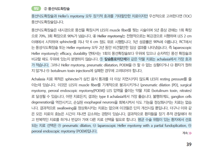 PPI는 heartburn, regurgitation 증상이 있을 때 투약하며, TCA는 CCB에 반응이 없을 때 고려되는 약제입니다. Heller's myotomy는 achalasia의 수술적 치료이고 Nissen fundoplication은 GERD의 수술적 치료입니다.