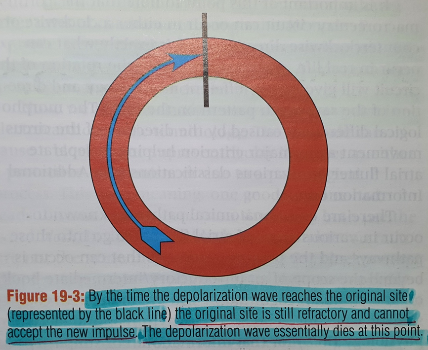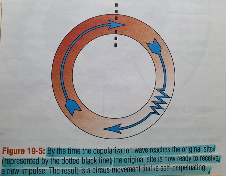 이 용어가 의미하듯이 reentry는 어느 한 complex가 이전에 depolarization된 심장 부위로 impluse가 다시 되돌아 가는 것입니다. 이 impulse는 단지 한 방향으로만 이동할 수 있고 어느 한 cell의 depolorization은 cell-to-cell depolarization을 일으켜서 빠르게 이동하며 circle을 이룰 것입니다. 이 전파는 아주 빨라서 impulse가 원래 처음에 depolarization된 부위로 되돌아 오면, 원래 세포는 여전히 refractory 상태일 것이고 refire가 불가능합니다.