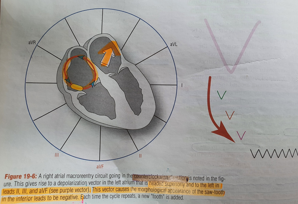 Depolarization wave가 macroreentry circuit을 한 번 회전할 때마다 이것은 좌심방을 자극하고 좌심방에 의해 만들어진 벡터 방향이 saw-tooth 모양에서 teeth의 방향을 결정합니다. 아래 그림을 보면 II, III, aVF에서 톱니 모양은 negative이고 depolarization wave는 자발적으로 지속되기 때문에 심전도에서 teeth 사이에 isoelectric segment가 보이지 않습니다.