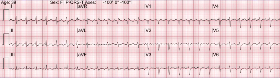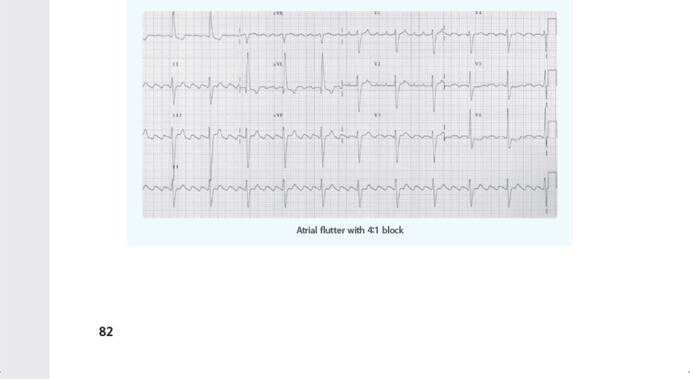 1:1 또는 2:1 conduction처럼 빠른 심실 반응이 있는 경우 flutter waves는 QRS 또는 ST-T 파 부위에 묻혀 있습니다. 이러한 경우 saw-tooth pattern는 깊지 않거나 약간 비대칭입니다. Atrial flutter를 평가하기 좋은 최고의 leads는 II, III, aVF, V1입니다. 가장 흔한 심방 조동 유형은 II, III, aVF에서 negative F wave, V1에서 positive F wave입니다. 심실 박동수가 140-160 BPM일 때 atrial flutter가 없는지 살펴보고 심실 박동수가 150 BPM이라면 특히 사실입니다. 다른 것들이 진단되지 않는 한 심실 박동수가 150 BPM이라면 심방 조동입니다.