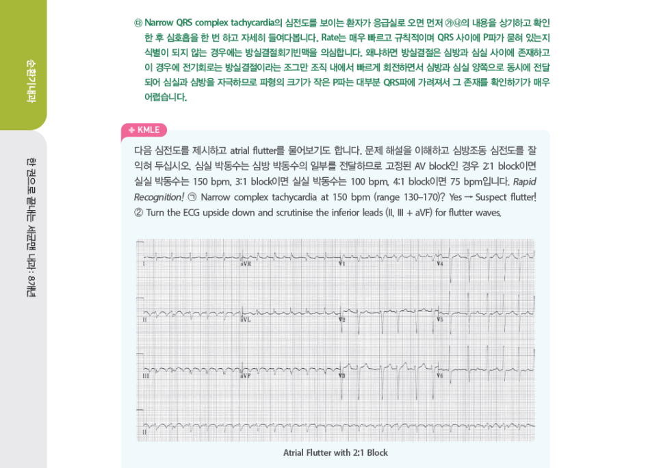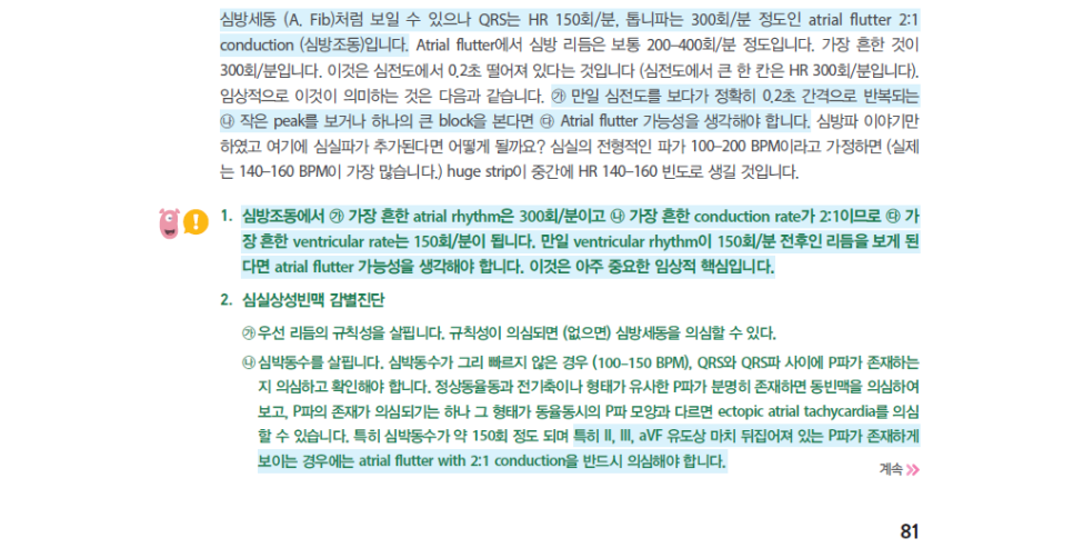 심방 조동에서 심방 박동수는 200-400 BPM이고 가장 흔한 박동수는 300 BPM입니다. 이것이 의미하는 바는 negative이든 postive이든 정확히 0.20초라는 것이며 (작은 심전도 눈금 5칸) 이것이 임상적으로 의미하는 바는 심전도에서 정확히 0.2초 간격 (한 개의 큰 칸)의 peak 파를 보게 된다면 atrial flutter를 생각해 볼 필요가 있다는 것입니다. 이러한 내용은 '한 권으로 끝내는 세균맨 내과 : 8개년, 순환기내과 81페이지'에 언급되어 있습니다.