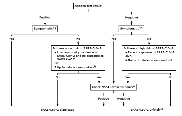 Because antigen tests are generally less sensitive than NAAT, the results are interpreted based on the pre-test probability of COVID-19. This algorithm does not apply to individuals with documented SARS-CoV-2 infection in the prior 3 months; these individuals have a low risk of infection but may have positive NAAT following infection.