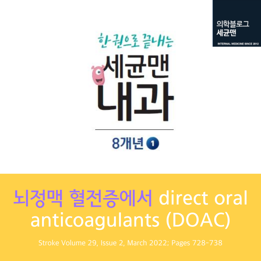 재발을 막기 위해 급성기 이후 뇌정맥 혈전증 환자에서 항응고 치료가 권고되지만 DOACs과 관련된 결과는 제한적이었습니다. 뇌정맥 혈전증 환자 845명을 대상으로 한 후향적 ACTION-CVT study에서 와파린 치료 그룹은 52%, DOAC 치료 그룹은 33% (대부분 에픽사반), 두 약제 모두 사용 그룹은 15% (시간적은 다른 시기에)이었으며 추적 영상 검사에서 혈관재개통률, 사망, 혈전증 재발은 약 1년째에 유사했습니다. 그러나 DOAC을 사용한 그룹이 더 낮은 주된 출혈과 관련이 있었습니다 (adjusted hazard ratio 0.35, 95% CI 0.15-0.82). 중증 내원 증상 환자에서 경험은 다소 제한적이지만 이 결과들은 DOAC이 뇌정맥 혈전증에서 합리적인 치료 선택임을 제시합니다.