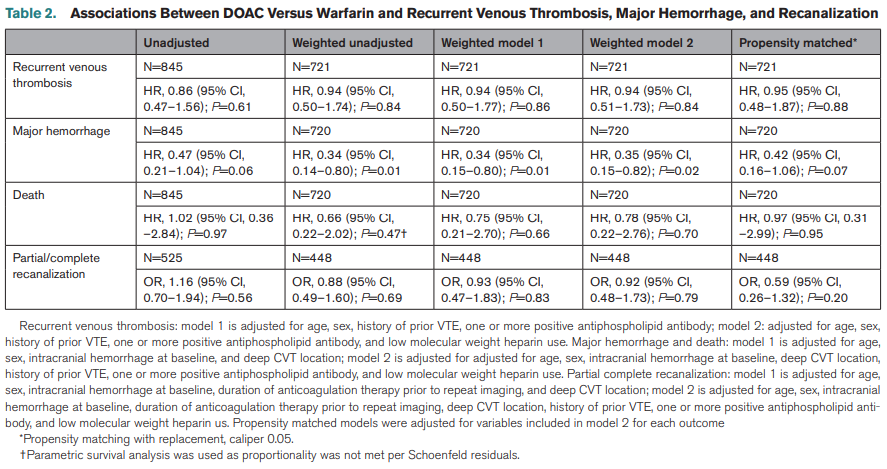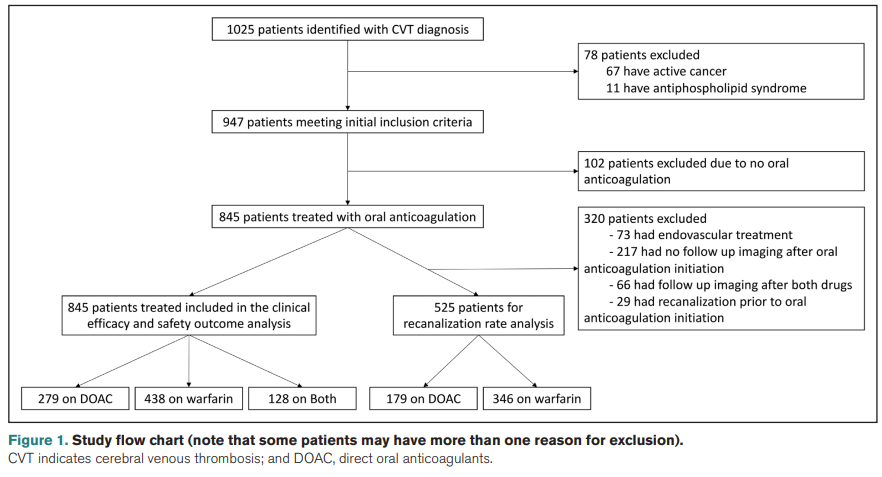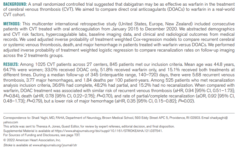 Since the introduction of direct oral anticoagulants (DOACs), clinical practice has changed to adopt these agents as first-line oral therapies over vitamin K antagonists (VKAs) for patients with deep venous thrombosis and pulmonary embolism (venous thromboembolism [VTE]). Consistently, randomized trials have demonstrated the efficacy of DOACs for prevention of recurrent VTE to be noninferior to VKAs. The safety profile of DOACs is more favorable than VKAs, borne out in the reduction of major or clinically relevant nonmajor bleeding events.1 This level of evidence is lacking for management of atypical site thrombosis, including cerebral venous thrombosis (CVT), for which existing consensus-based guidelines still do not recommend the use of DOACs.2,3 Despite this, clinical practice over the past several years has shifted in favor of increasing physician comfort in using DOACs for CVT. The RESPECT-CVT trial (Safety and Efficacy of Dabigatran Etexilate vs Dose-Adjusted Warfarin in Patients With Cerebral Venous Thrombosis) and the CVT subgroup of the EINSTEIN-Jr trial (Oral Rivaroxaban in Children With Venous Thrombosis) have provided some reassurance for this approach but are underpowered to draw firm conclusions about either efficacy or safety. Stroke. 2022;53:739–741