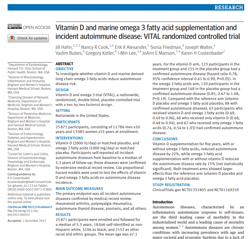 Placebo-controlled VITAL study (2018년)에서 50세 초과의 25,000명 성인들을 무작위 할당하여 5년 동안 비타민D (cholecalciferol; 2000 IU daily) 복용, 오메가-3 지방산 (1 g daily) 복용, 두 가지 모두 복용, 어떠한 것도 복용시키지 않았습니다. 어떠한 조치도 암 또는 심혈관질환 예방에 효과적이지 않았습니다. 이 연구의 사전 지정된 보조 분석에서, 연구자들은 이러한 개입이 새로운 자가면역질환에 미치는 영향을 평가했습니다 (연간 설문지의 자체 보고와 의료기록 검토에 의해 확인).