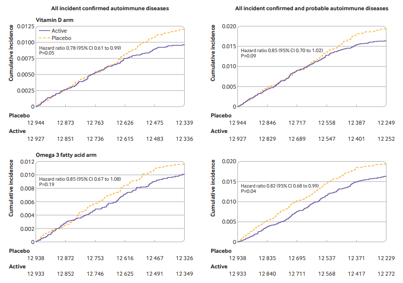 위약을 복용 중인 사람들보다 비타민D를 복용 중인 사람들이 사람들에서 자가면역질환이 덜 확인되었습니다 (123 vs. 155 patients). 그룹 간 차이는 통계적으로 거의 유의하지 않았습니다 (adjusted hazard ratio, 0.78; P=0.05). 시험의 마지막 3년에서 AHR은 0.61이었습니다. 새롭게 확인된 자가면역질환은 위약을 복용 중인 그룹보다 오메가-3 지방산을 복용 중인 그룹에서 다소 덜 일반적이었습니다 (130 and 148 patients; AHR, 0.85). 이 차이는 통계적으로 유의하지 않았습니다. 그러나 어느 것도 복용하지 않은 그룹과 비교하여 비타민D와 오메가-3 지방산 모두 복용하였던 사람들에서 자가면역질환 발생이 의미 있게 더 낮았습니다 (AHR, 0.69; P=0.03).