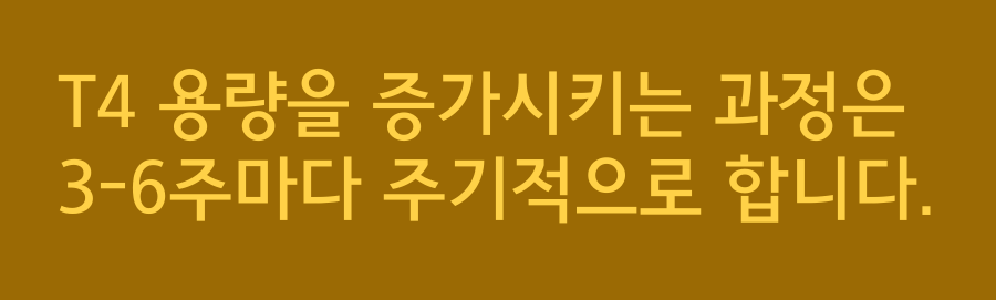 6주까지 기다리기 보다는 3주 후에 다시 FT4, TSH 검사를 합니다. 만일 FT4 수치가 낮다면 3주째에 증량합니다. 3주째는 안정기는 아닙니다. 이 때는 FT4가 정상이거나 높더라도 TSH가 지속적으로 감소하고 있는 시기입니다. 따라서 이 때는 안정된 FT4, TSH 수치라고 생각해서는 안됩니다. T4의 반감기는 일주일이기 때문에 초기 치료를 하거나 약제 변경을 한 이후에 호르몬이 안정화 되는 시기는 6주 정도입니다.
