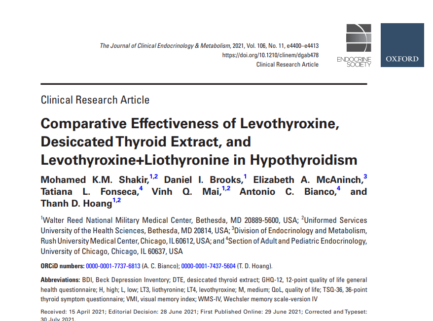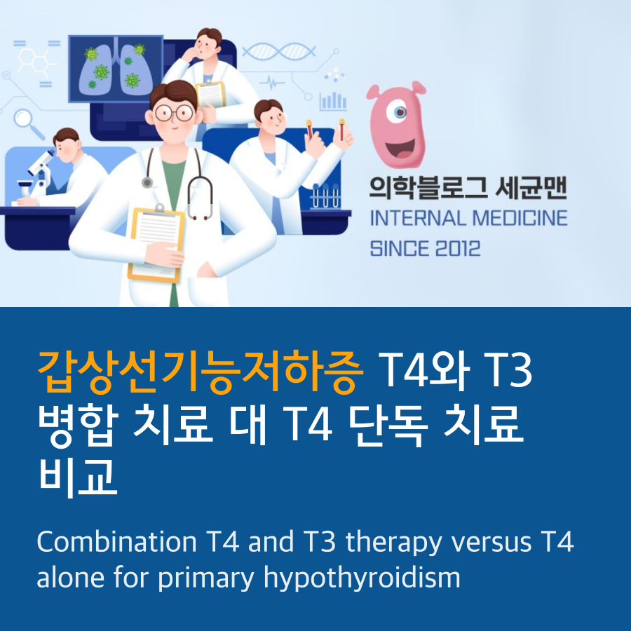 이전에 안정된 용량의 T4로 치료 중이었던 75명 갑상선 환자에서 T4 단독, T4와 T3 병합, 건조 갑상선 추출물을 평가한 교차 시험을 시행하였고 환자의 선호도 또는 갑상선 증상 또는 일반건강설문 점수에서 차이가 없었습니다. 그러나 처음 가장 많은 증상이 있었던 20명의 환자는 T4 단독 치료보다 T4와 T3 병합치료 또는 갑상선 추출물에 대한 강한 선호를 보였고 점수에서도 유의미한 개선을 나타냈습니다. 이 하위그룹 분석은 갑상선기능 저하증의 원인, T4를 복용하는 동안 혈청 갑상선 검사, deiodinase 2 gene의 다형성 유무에서 유의미한 차이를 보이지 않았습니다. 비록 T4와 T3의 일상적 병합 사용을 제안하지 않지만 선택적 환자에서 T4와 T3 병합 치료 시도로 이득이 있을 수 있습니다.
