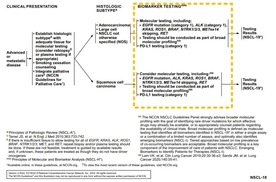 가능하다면 진행성 NSCLC 환자에서 driver mutation의 존재에 대해 평가를 해야 합니다. 추가적으로 선순위 면역 치료 사용을 알기 위해 새롭게 진단된 진행성 비소세포폐암 모든 환자에서 일상적인 programmed cell death ligand 1 (PD-L1) 검사를 권고합니다.