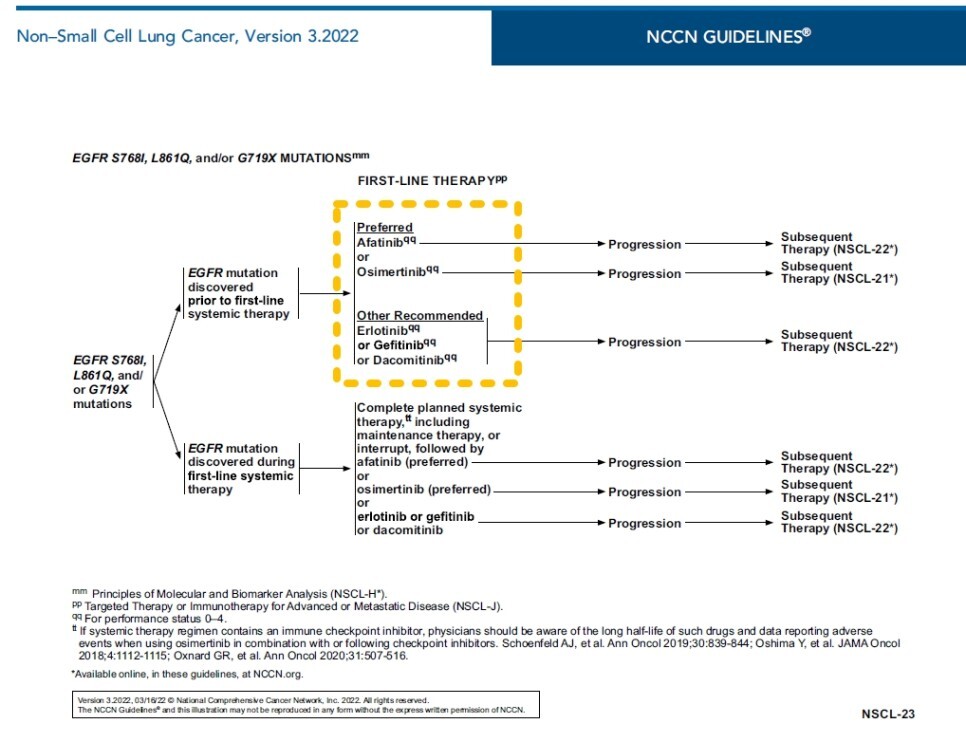 Epidermal growth factor receptor (EGFR) tyrosine kinase inhibitors ([TKIs] osimertinib, erlotinib, gefitinib, afatinib)를 단일 약제로 사용하는 치료는 EGFR의 activating mutation을 포함하는 종양을 가진 환자에서 필요합니다. 이것은 확인된 driver mutation를 가지고 있는 환자에서 항암치료와 면역치료보다 선호됩니다.
