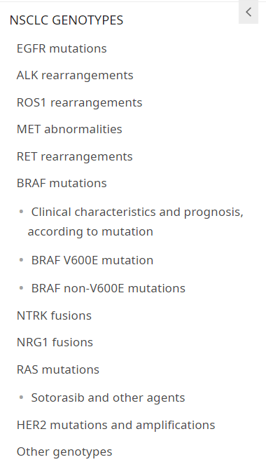 ★ 일부 진행성 NSCLC 종양, 특히 epidermal growth factor receptor (EGFR)의 돌연변이, anaplastic lymphoma kinase (ALK) gene 또는 c-ROS oncogene 1 (ROS1) gene의 재배열에서 특정 tyrosine kinases의 oncogenic activation의 확인은 패러다임 전환과 특정 분자 치료법의 개발로 이어졌습니다.