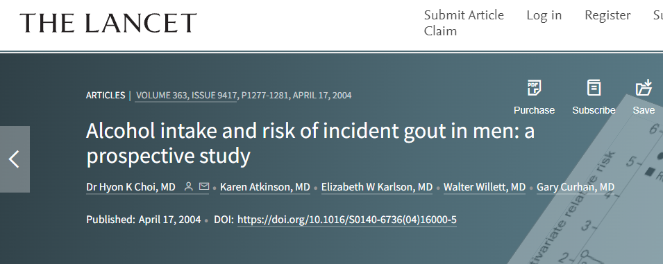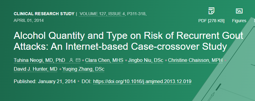 The association between alcohol consumption and risk of gout has been suspected since ancient times, but has not been prospectively confirmed. Additionally, potential differences in risk of gout posed by different alcoholic beverages have not been assessed.