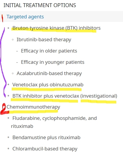 지난 수십년 동안 CLL의 초기 치료는 아주 많이 변했습니다. 한 때 chemoimmunotherapy가 모든 환자들에서 표준 치료였지만, 이제 대부분의 환자들은 BTK 또는 BCL2에 대한 targeted therapy [c/s CD20 monoclonal antibody] 치료를 받습니다. 이 치료 약제들은 활발히 연구되고 있고 표준 치료가 빠르게 변화하고 있습니다.