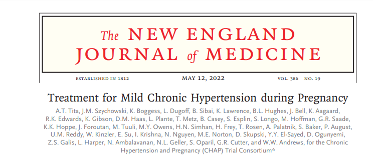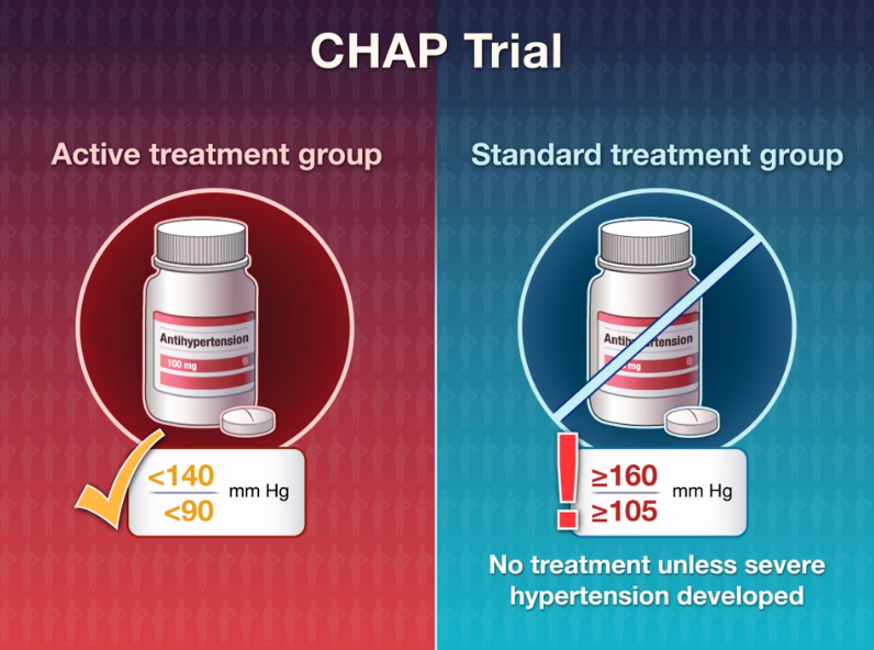 - Chronic Hypertension and Pregnancy (CHAP) trial에서 2400명의 23주 미만 임신부를 대상으로 <140/90 이하로 유지하기 위한 적극적 치료 그룹과 160/105 이상인 경우에만 치료를 하는 보통 그룹 (대조군)으로 무작위 할당. 적극적 치료 그룹에서 의학적으로 필요했던 <35주 조산 (12.2% 대 16.7%), 전자간증 (23.3% 대 29.1%)을 포함한 composite adverse pregnancy outcome의 18% 상대적 감소.