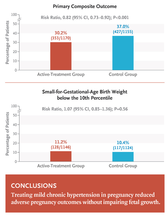 - 결론은 mild chronic hypertension인 임신부에서 혈압이 160/100 이상인 경우메만 치료하는 것보다 140/90를 목표 혈압으로 치료하는 것이 small-for-gestational-age birth weight 증가 없이 더 나은 임신 결과와 관련이 있었음.