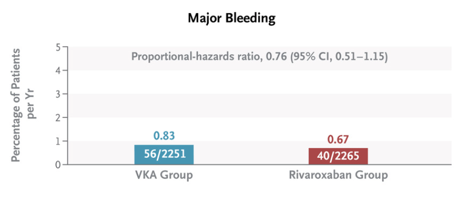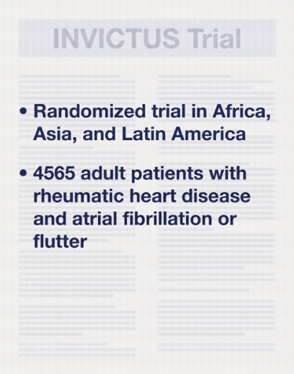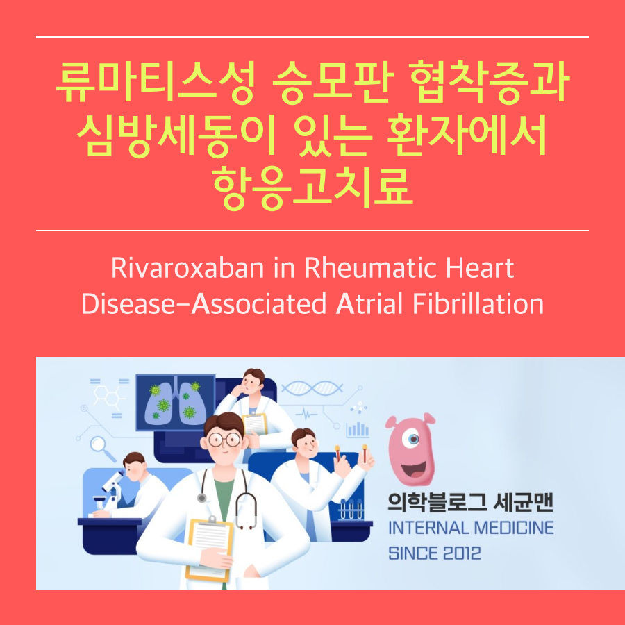 류마티스성 심장질환 관련 심방세동 환자에서 비타민K 길항제는 리바록사반 그룹보다 출혈율을 높이지 않으면서 composite of cardiovascular events or death 비율을 더 낮추었습니다. 심방세동, 좌심방 혈전, 이전 색전 병력으로 인하여 항응고치료를 필요로 하는 류마티스성 승모판 협착증 환자에서 항응고제로서 DOAC보다 비타민K길항제 (예, 와파린)를 권고합니다. 목표 INR은 2.5 (범위 2.0-3.0)입니다.
