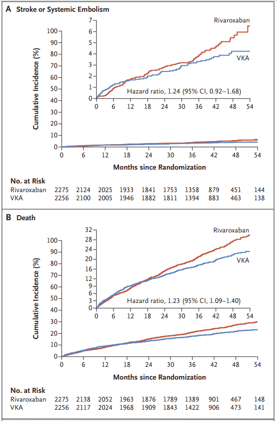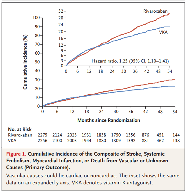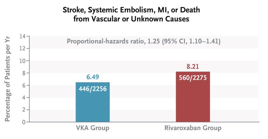 Primary outcome은 composite of stroke, systemic embolism, myocardial infarction, death from vascular or unknown cause.