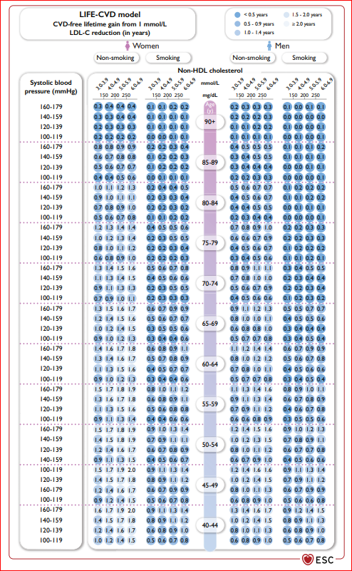 ■ 건강한 성인에서 LDL-C 감소의 평생 치료 이득은 환자-의사간 치료 시작 상담에 도움이 된다. 다음은 low-modrate countries의 건강한 성인에서 LDL-C을 40 감소시켰을 때 CVD에서 자유로울 수 있는 평균 기간 (year) 이득이다. ■ 이 가이드라인은 stepwise approach를 권고하며 step2에서 치료 강화 수준은 이전 2016 ESC prevention Guideline에서 가장 낮은 LDL-C 목표 수치인 70 mg/dL보다 더 낮다. 이번에는 ASCVD가 있거나 very high risk인 경우 < 55 mg/dL가 목표이다. ■ 최근 2년 이내에 ASCVD를 경험하였다면 40 mg/dL까지 낮추는 것도 고려될 수 있다. 치료 이득 차이는 남녀 사이, 젊은/고령 사이, 당뇨 유무에 따라 달라지지 않는다.