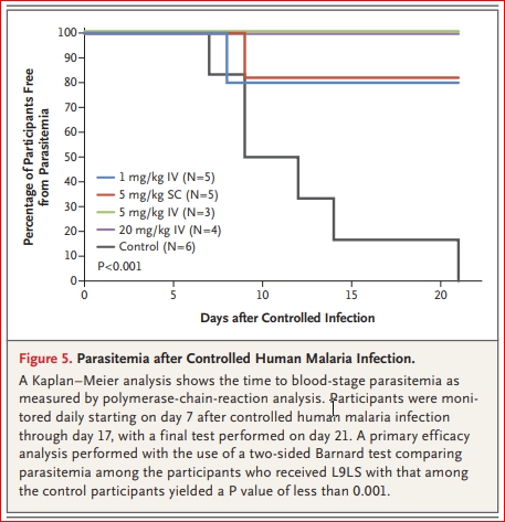 첫 번째는 P. falciparum을 전염시키는 모기에 노출된 미국의 건강한 비임신 성인을 대상으로 한 open-label trial이었고 IV 또는 SC L9LS를 투여 받은 17명 가운데 15명 (88%)에서 parasitemia가 예방되었으나 예방조치를 취하지 않은 6명에서는 예방 효과가 없었습니다. 중증 이상 반응은 보고되지 않았습니다.