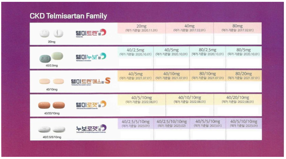 - 텔미누보 : telmisartan/S-amlodipine : 40/2.5 mg, 40/5 mg, 80/2.5 mg, 80/5 mg