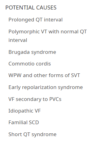 - 명백한 구조적 심장 질환이 없는 대부분의 SCD 환자들은 실질적으로 정상 심장을 가지고 있지 않지만 진단적 수단이 구조적, 기능적 이상을 확인하지 못하는 것 같다. 예전에는 많은 원인들이 unknown이었지만 좀 더 완전한 평가로 이러한 환자들에서 primary electrical disorder (예, long QT, Wolff-Parkinson-White [WPW], catecholaminergic polymorphic ventricular tachycardia [CPVT], Brugada syndrome)가 확인되었다.